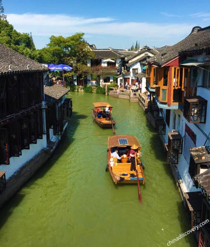 Il borgo più celebre di Qingpu è Zhujiajiao, spesso definito la “Venezia d’Oriente”. Fondato oltre 1700 anni fa, questo villaggio fluviale è un intreccio di canali, vicoli lastricati e case dalle tegole grigie che si specchiano nell’acqua. Passeggiare tra i suoi ponti in pietra – se ne contano ben 36 – è come camminare dentro una poesia. Il più famoso, il Fangsheng Bridge, risale al XVI secolo e offre una vista suggestiva sul lento scorrere dei battelli. Le barche a remi, ancora oggi utilizzate per trasportare turisti e merci, aggiungono un tocco di autenticità a un paesaggio che sembra attinto da un dipinto.